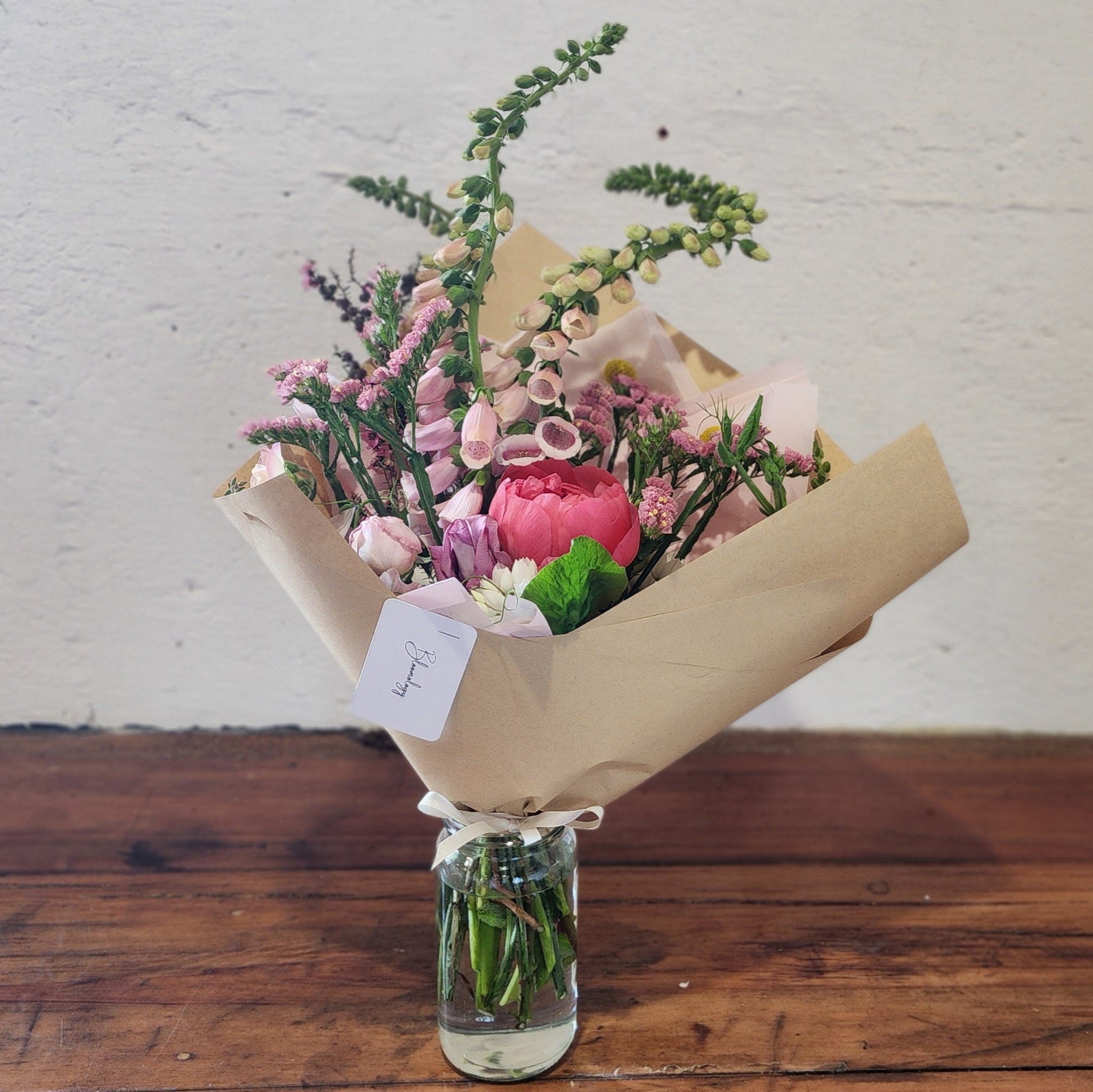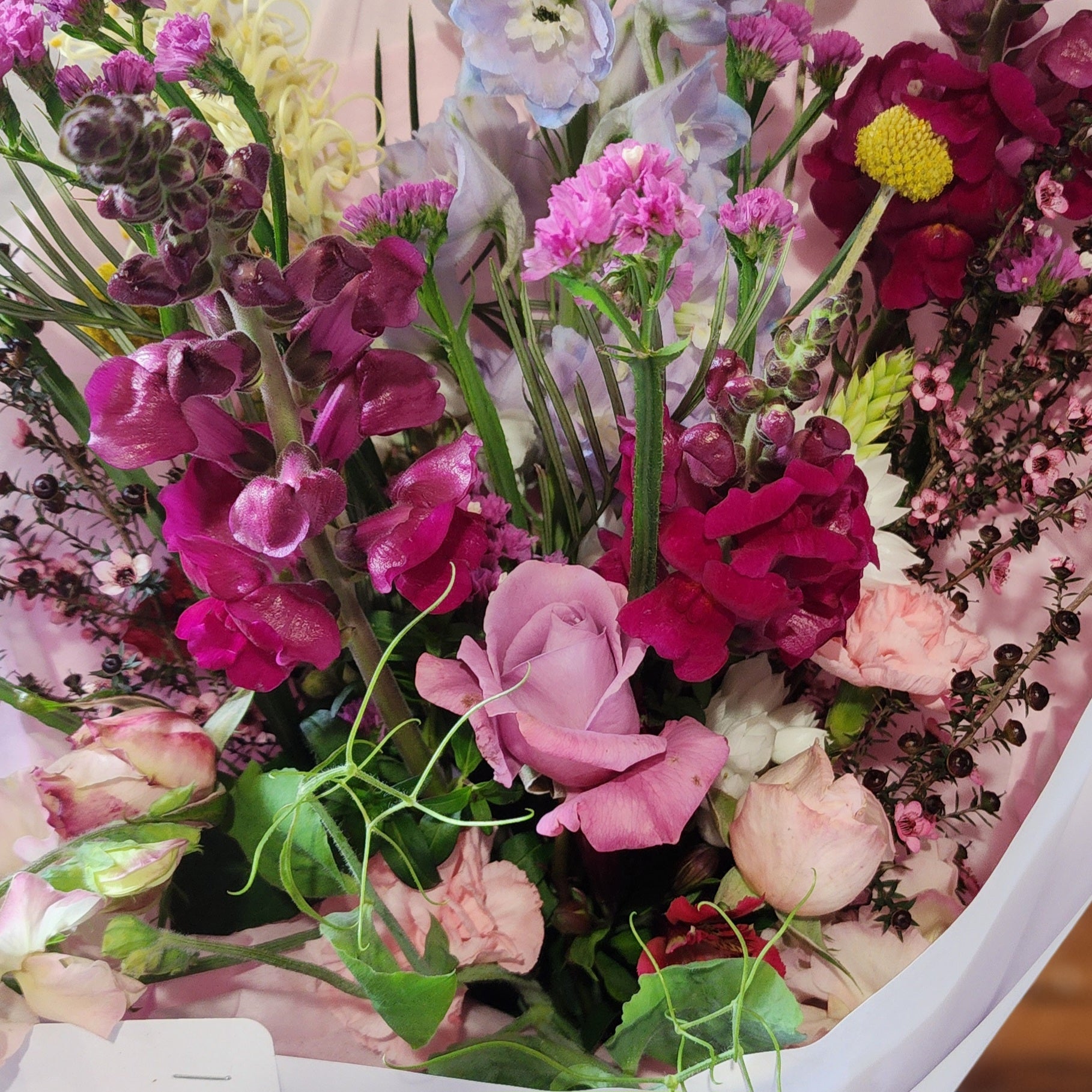 A wonderful mix of seasonal flowers and foliage beautifully wrapped and tied with a ribbon.